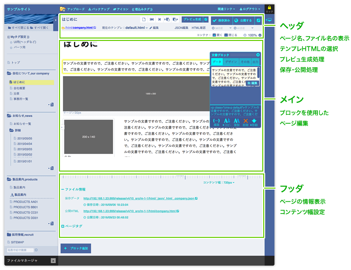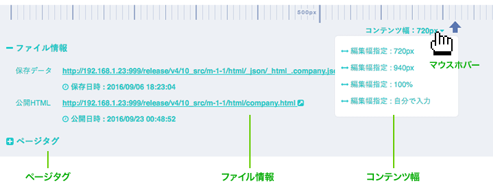 | ファイル情報 | 現在のページの保存データ、公開ページのURL、保存日時を表示します。 |