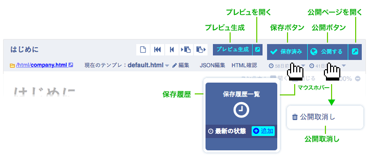| 公開ボタン | HTMLページとして公開します。 下には、公開日時が表示されます。 |