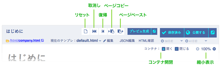 | コンテナ開閉 | ページ内のすべてのコンテナの開閉を行います。 公開ページには、影響ありません。 |
