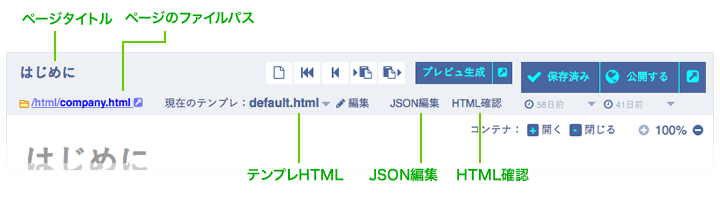 | プレビュ生成 | クリックすると、現在のページのプレビュー用HTMLページを生成します。公開する前にページを確認したい場合に利用します。 |