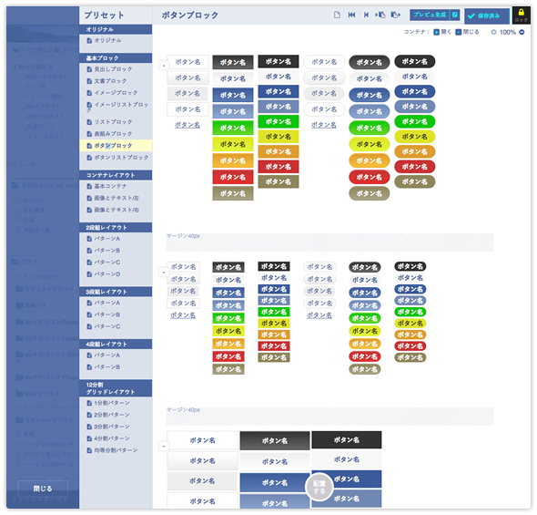 ブロックのプリセットに設定済みボタンが登録されているので、このなかから選んで追加できます。