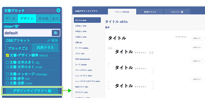 直接CSSを記述して新規プリセットを追加することもできますが、JS CMSでは、支援機能として、デザインライブラリウィンドウで、ブロックのデザインのカスタマイズが行えます。
