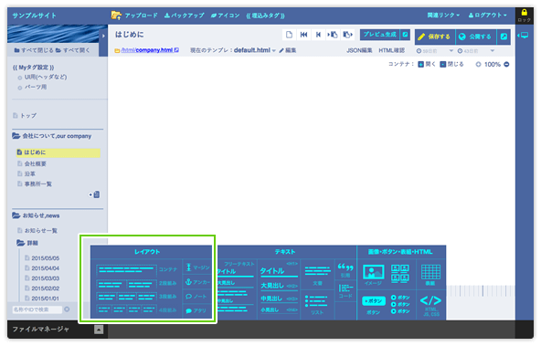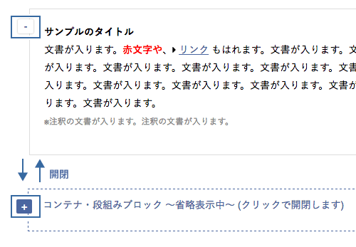 公開ページには影響はなく、ページ編集画面においてのみ有効です。ページの情報量が多い場合などに、省略表示を行い、見通しよく、編集できるようにします。