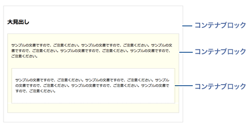 コンテナは入れ子構造にすることができ、コンテナブロックへ、さらにコンテナブロックを配置できます。