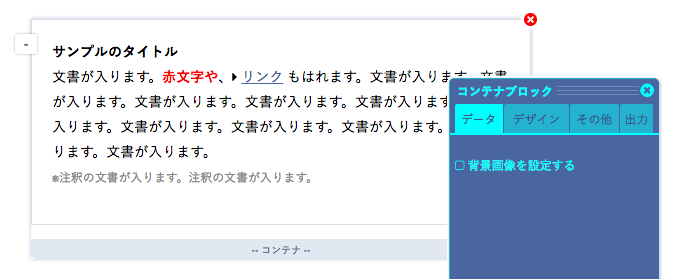 コンテナブロックへの、ドラッグによるブロックの配置方法や、省略表示などは、段組みブロックも同様です。