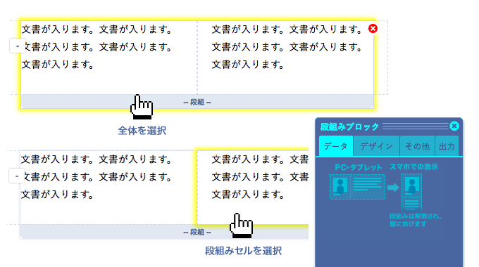 段組みブロックは全体を選択できるほか、個別のブロックも選択でき、個別のブロックに対して、幅を設定したり、背景色を設定したりできます。