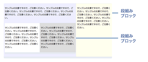 段組みブロックは、横方向にコンテナブロックを配置し、他のブロックを配置できる特別なブロックです。