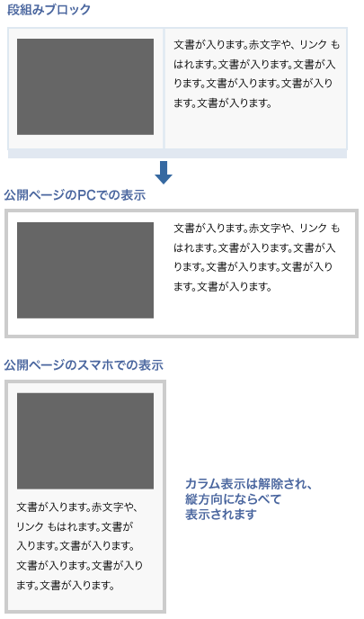 公開ページを表示したとき、PCの場合は、そのままカラム状態で表示されますが、スマホで表示した場合は、カラム表示は解除され、縦方向にならべて表示されます。