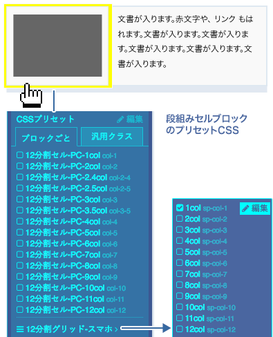 段組みブロックのCSSで、12分割グリッドを選択した場合、セルのプリセットで、個々のカラムの幅の比率を指定できます。