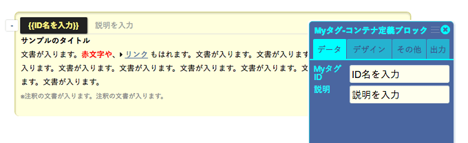 Myタグを定義します。コンテナブロックなので、自由に他のブロックを配置できます。