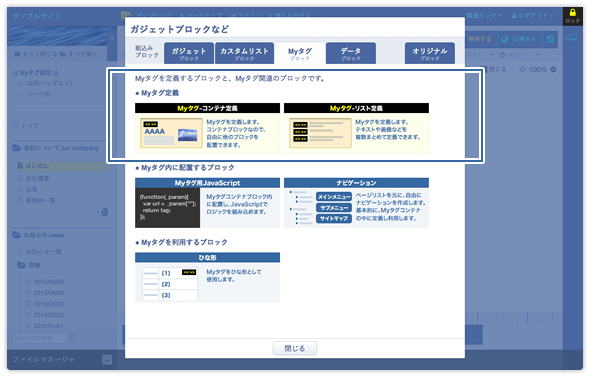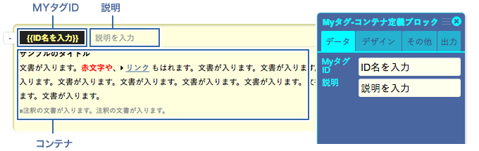 | Myタグ設定ページ | このページに配置したMyタグ定義ブロックは、すべてグローバルなMyタグになります。 Myタグ定義ブロック以外のブロックは、特に公開サイトなどには影響ありません。見出しタグなどつかって、ページをわかりやすく出来ます。 |