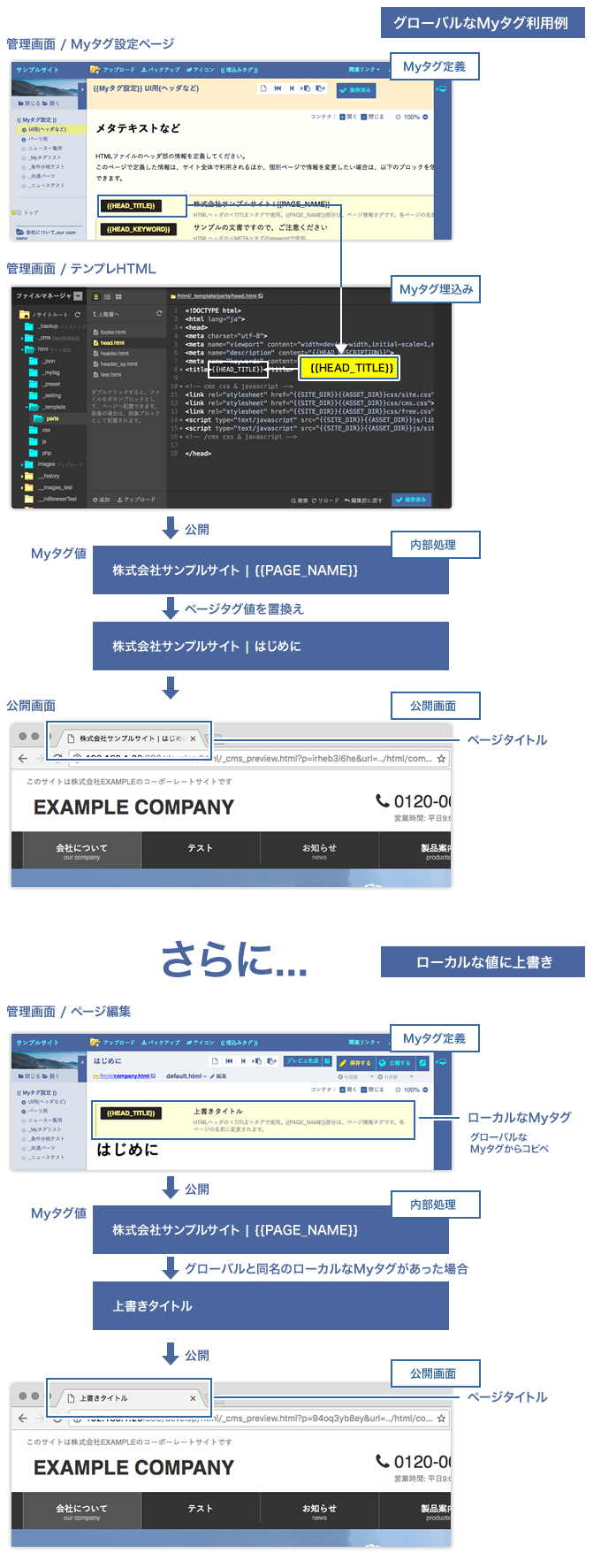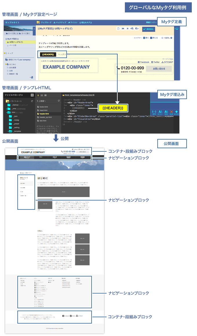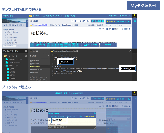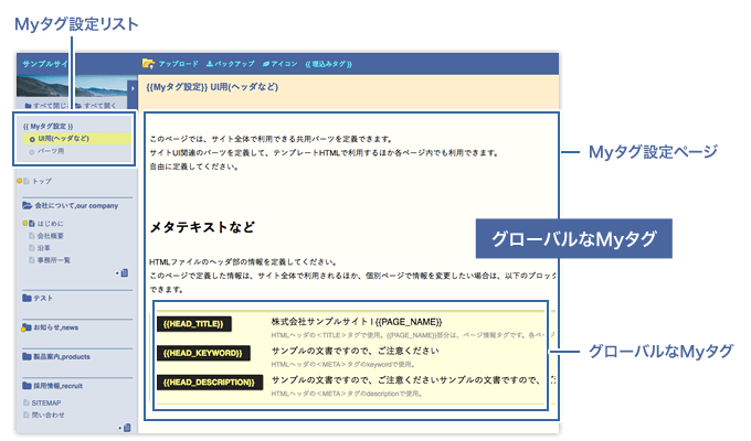 グローバルなMyタグは、CMS内のページ全てで利用できます。そのほか、テンプレートHTML内で利用できます。 |