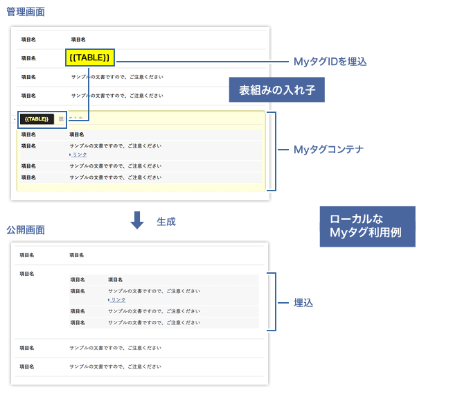 ローカルなMyタグは、ページ内に何度も出てくる共通パーツのほか、例えば、以下の表組みの入れ子なども簡単に実現できます。