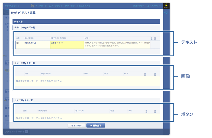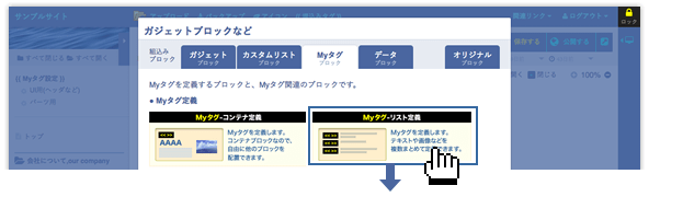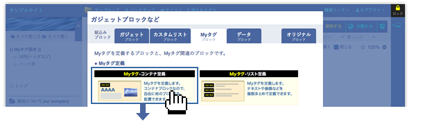 Myタグを定義します。テキストや画像などを複数まとめて定義できます。