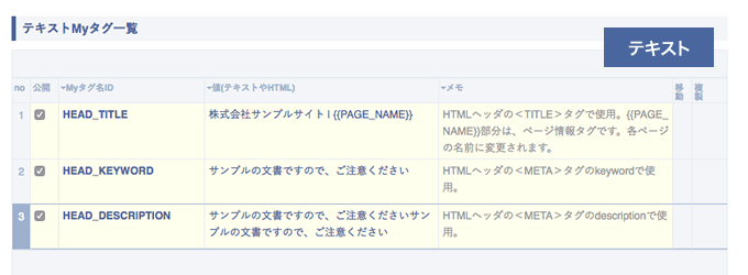 | 値 | テキストやHTMLタグを登録できます。 サイト内で共通して利用するテキストなどを登録します。 例えば、HTMLヘッダのタイトル、説明などのMETAタグや、メールアドレス、定型文などです。 |