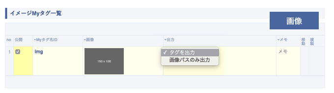 | 出力 | 登録した画像ブロックの出力形式を選択できます。 「タグを出力」の場合は、そのまま画像ブロックを出力します。 「画像パスのみ出力」の場合は、登録した画像のパスのみ出力し、汎用的な用途で利用できます。 |