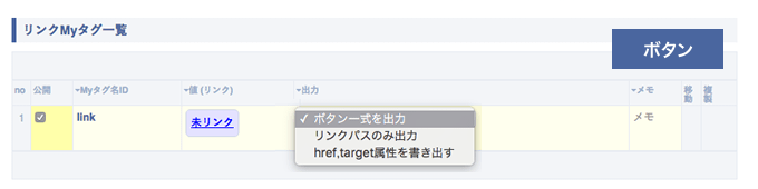 | 出力 | 登録したボタンブロックの出力形式を選択できます。 「タグを出力」の場合は、そのままボタンブロックを出力します。 「リンクパスのみ出力」の場合は、登録したボタンのリンクパスのみ出力し、汎用的な用途で利用できます。 「href,targetのみ出力」の場合は、登録したボタンのhref,target属性のみ出力し、汎用的な用途で利用できます。 |