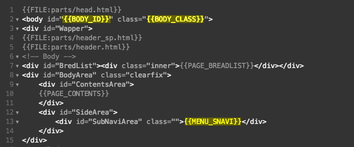 | 主な用途 | - METAタグ(title,descriptionなど) - ヘッダやメニューなどのUIパーツ(ブロック) - サイト全体で繰り返して利用する共通パーツ(ブロック) |