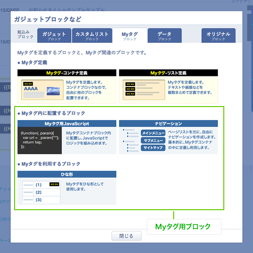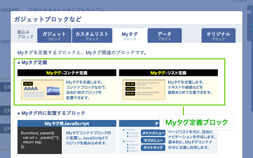 | ナビゲーションブロック | グローバルナビや、ローカルナビ、サイトマップなどを定義できます。 Myタグ以外でも利用できますが、主にMyタグ-コンテナ定義に配置します。 |