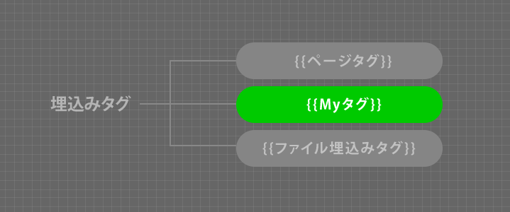 ヘッダやフッダなどの、サイト内で完全に共通しているUIパーツのほか、ちょっとしたテキストフレーズなどで利用します。 | 定義:Myタグブロックで自由に定義 利用:MyタグIDを記述 |