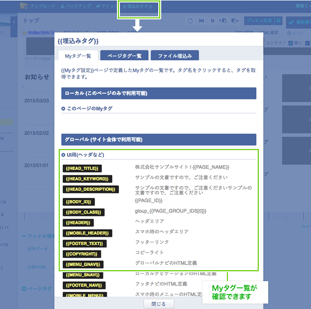 Myタグには、サイト全体で共通して利用できるグローバルなMyタグと、定義したページのみで利用できる、ローカルなMyタグがあります。