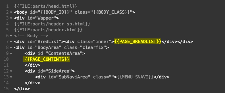| 主な用途 | ページの編集内容をテンプレHTMLへ埋め込んだり、タイトルタグに各ページ名を埋め込んだりします。 |