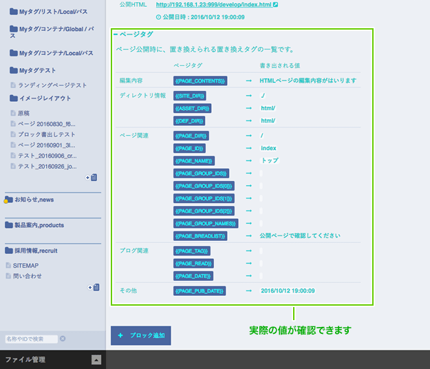 ページタグは、主にテンプレHTML内で利用して、ページのIDや名称、コンテンツのHTMLなどを書き出します。