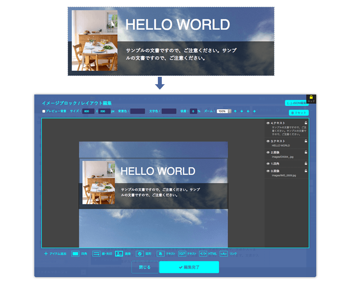 イメージブロックに追加された機能で、画像やテキストなどの、簡易なレイアウトが行えます。