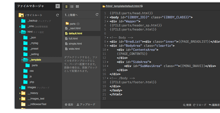 ファイルマネージャを追加しました。サイトルート以下の、テキスト編集やファイルアップロードなど、汎用的な用途で使えます。