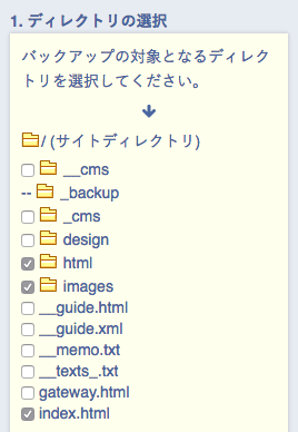 サイトルート以下のディレクトリと、ファイル一覧が表示されます。チェックを入れたファイルが、バックアップファイルの対象になります。