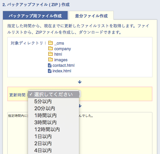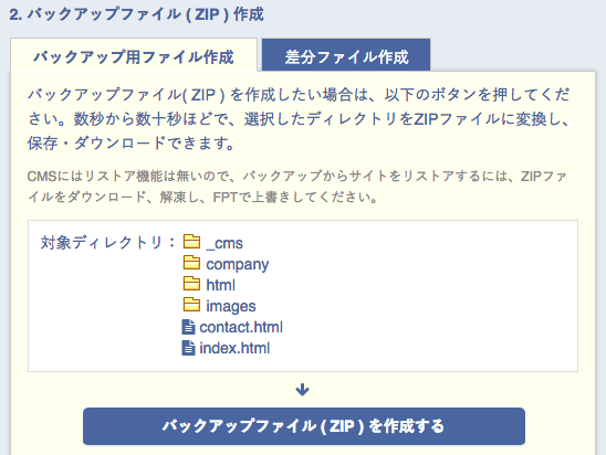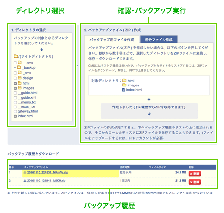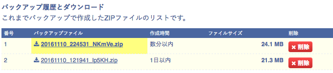 | バックアップ履歴 | これまでバックアップで作成したZIPファイルのリストです。 ファイル名をクリックすると、ZIPファイルをダウンロードできます。 |