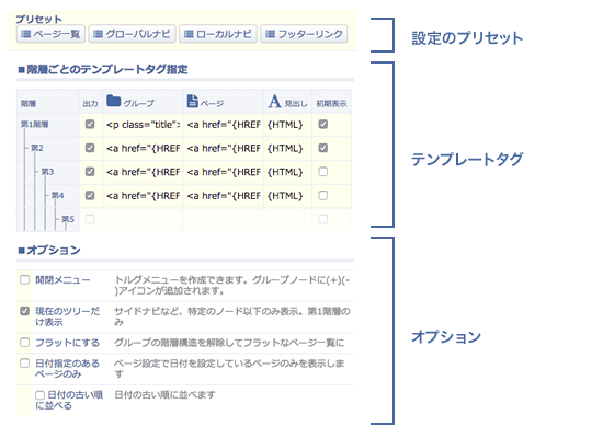 テンプレートタグでは、階層ごとにテンプレートとなるタグを指定します。