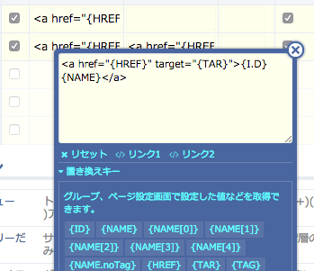 テンプレートタグでは、置き換えキーを指定していきますが、入力ウィンドウ内で、どのようなキーがあるのか確認できます。