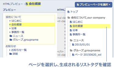 ナビゲーション編集では、グローバルナビや、ローカルナビなど、ページ一覧情報をもとにリストを生成できます。