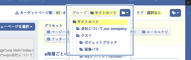 | ページ一覧 | ターゲット内のすべてのグループとページ。サイトマップ用です |