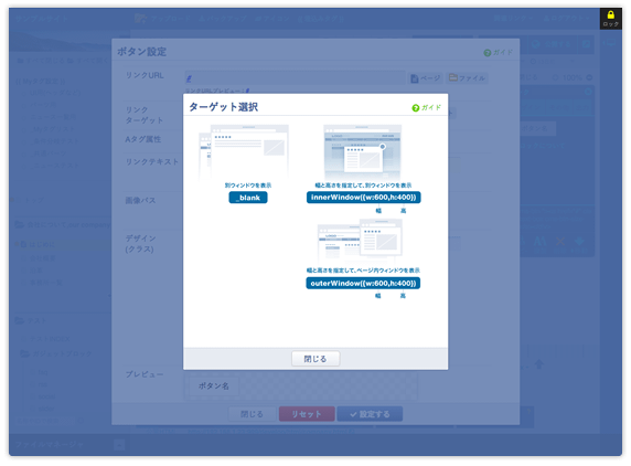 ボタンやリンク関連のウィンドウです。いろんなブロックから表示されるウィンドウです。