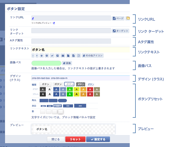 | ボタンプリセット | CMSでプリセットで用意されているCSSクラスを選択できます。 ボタンデザインや余白サイズなど、組み合わせて設定できます。 もちろん、自分でクラスを定義して、直接入力もできます。 |